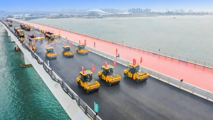 翔安大橋在建設中既要克服海上風浪大、潮差高、巖層強度高、跨越生態(tài)保護區(qū)等困難,又要兼顧綠色環(huán)保;要在這種復雜的環(huán)境中保證施工質(zhì)量,對設備和施工技術的選擇就顯得尤為重要。徐工數(shù)字化智能施工集群憑借其智能化、高精度、高效率等顯著優(yōu)勢,成功克服了傳統(tǒng)施工方式難以應對的諸多難題,可精準適配翔安大橋的橋面鋪裝工作。