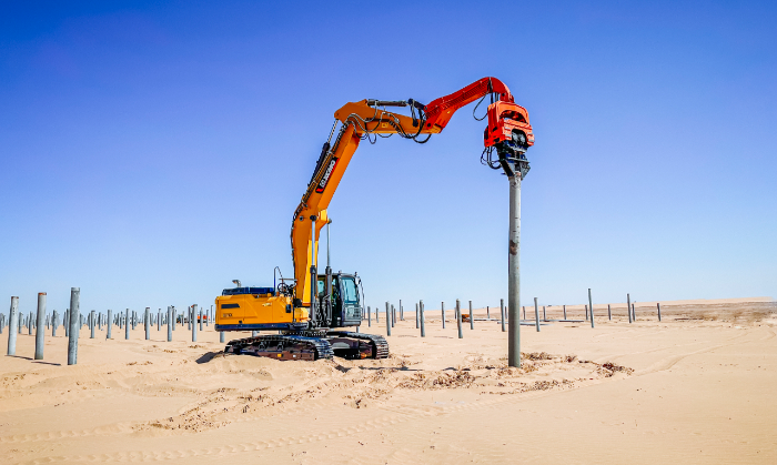 此次徐工挖掘機參建的巴彥淖爾100萬千瓦光儲+生態(tài)治理項目位于內(nèi)蒙古西部,是自治區(qū)年度重點工程,對當?shù)刭Y源開發(fā)和綠色發(fā)展具有重要意義。 與以往常規(guī)項目不同,此次徐工挖掘機主要擔任光伏樁的鋪設工作,通過改裝振動錘和引孔機等多功能屬具,有效滿足現(xiàn)場多元化施工需求。