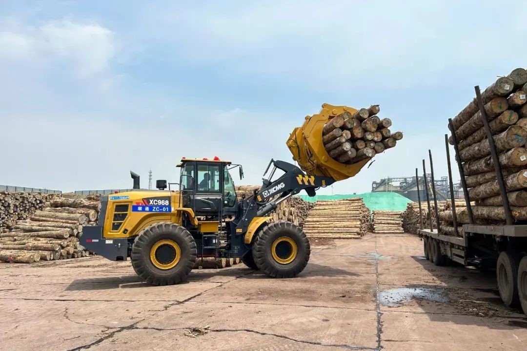 隨著滿載原木的貨輪緩緩靠岸,日照港瞬間切換為一派繁忙景象,20臺徐工XC968I夾鉗機(jī)迅速啟動、排列有序登上甲板,將原木從入港船舶上夾起、轉(zhuǎn)運(yùn)至等待裝運(yùn)的卡車,動作一氣呵成。