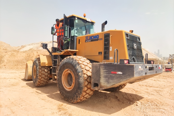 中東當(dāng)?shù)匾蛔笮凸珗@的建設(shè)現(xiàn)場,徐工LW700HV正熱火朝天地干著。