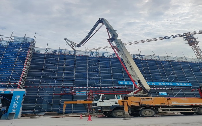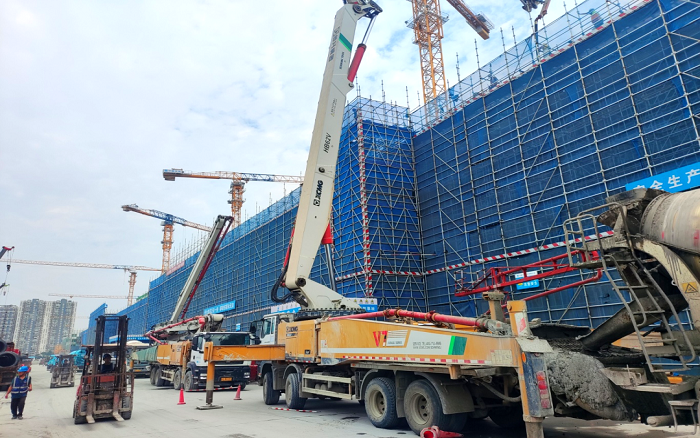 施工現(xiàn)場,臂架林立、機器運轉(zhuǎn),徐工成套混凝土機械聯(lián)袂出擊,新能源攪拌車、車載泵、泵車齊上陣,從混凝土運輸、泵送施工、服務(wù)保障等方面守護項目順利進行。