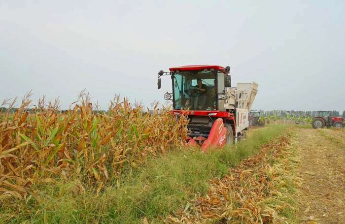 萬里晴空之下,XCA420玉米收獲機(jī)在田間來回穿梭,玉米植株連稈帶穗被收入機(jī)械中,頃刻間,摘棒、剝皮、秸稈粉碎一氣呵成。金黃的玉米果穗從儲糧倉傾瀉而下,由農(nóng)用運(yùn)輸車轉(zhuǎn)運(yùn)至糧倉。