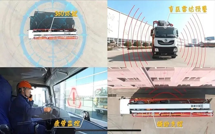 車身同時(shí)配有盲區(qū)雷達(dá)預(yù)警、360環(huán)視等輔助駕駛系統(tǒng),提升泵車駕駛安全系數(shù),行車更安心。