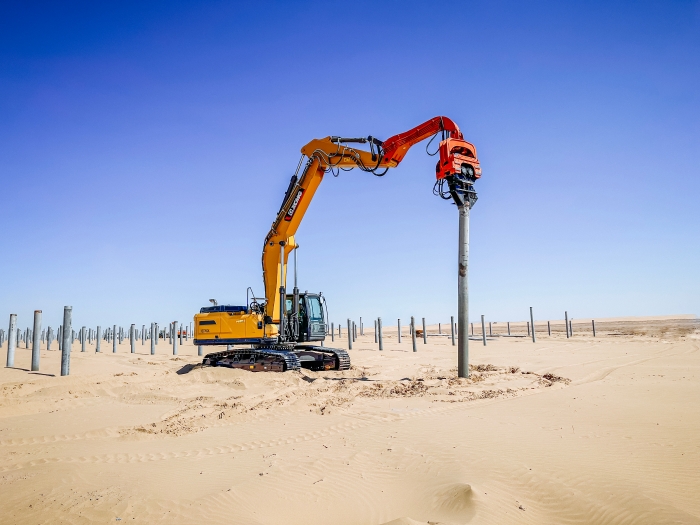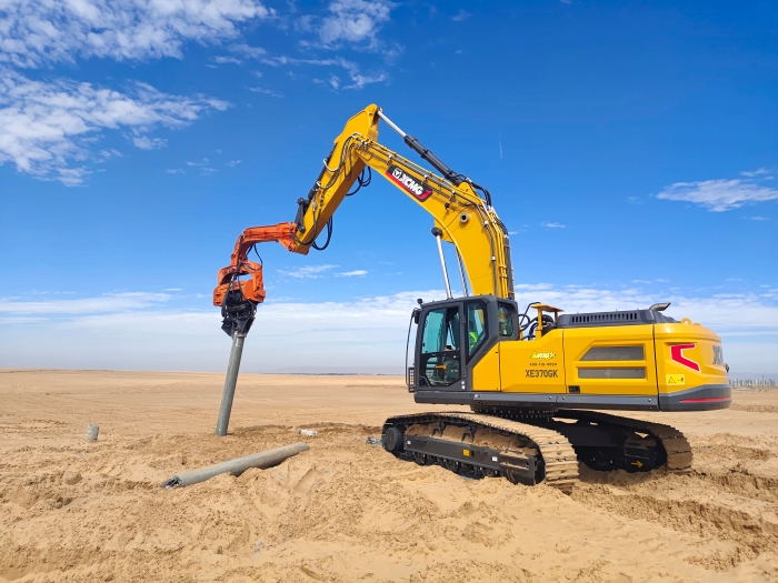 與以往常規(guī)項(xiàng)目不同,此次徐工挖掘機(jī)主要擔(dān)任光伏樁的鋪設(shè)工作,通過改裝振動錘和引孔機(jī)等多功能屬具,有效滿足現(xiàn)場多元化施工需求。