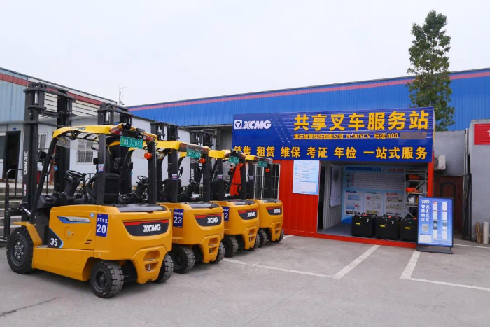 在重慶某大型物流園區(qū),累計超120臺徐工新能源共享叉車被投入使用。這些共享叉車24小時待命,園區(qū)內的服務站里不時有老板、叉車司機進行充換電和現場掃碼解鎖。