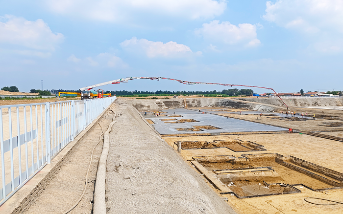 近日,在山東陵城某物流園建設現(xiàn)場,徐工72米泵車憑借卓越性能成為施工主力。