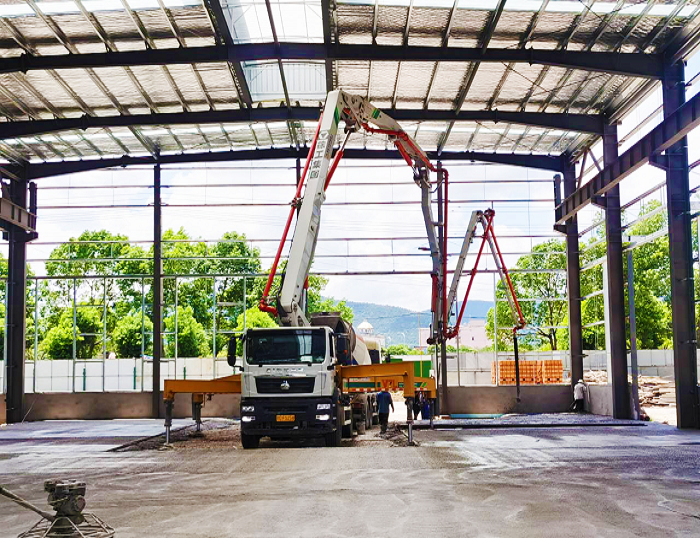 徐工HB37V泵車在宜興某廠房建設中,以“鋼鐵脊梁”之姿擔綱底板大體積澆筑重任。