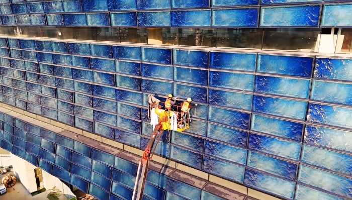 然而,將設(shè)計藍圖轉(zhuǎn)化為現(xiàn)實,首先面臨的挑戰(zhàn)便是其獨特的外墻施工。建筑立面需安裝上萬塊特制琉璃板,每塊尺寸達2.5米×1米,重量驚人地接近380公斤,且厚度存在精密的漸變。如此龐大且沉重的建材,對安裝作業(yè)的精準度、穩(wěn)定性與安全性都提出了極為苛刻的要求。