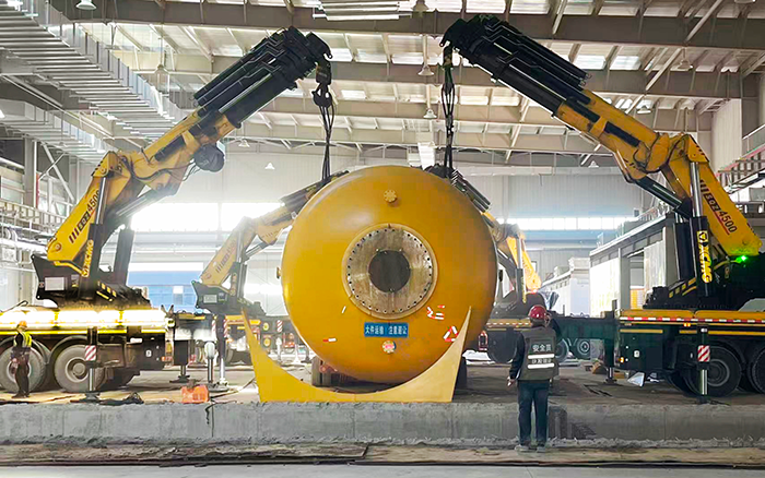 廠房車間層高受限、作業(yè)空間局促,給超大型設(shè)備轉(zhuǎn)運帶來極大挑戰(zhàn)。而 SQZ4500C 僅 3400mm 的外形高度,恰好適配低矮工況,無需拆改廠房即可靈活穿梭。其 6 節(jié)伸縮臂(四節(jié)雙推)最長可達 16.2m,具備強大的帶載伸縮能力,配合精準比例控制液壓系統(tǒng),四機協(xié)同實現(xiàn)毫米級走位,讓笨重的高溫爐在狹窄通道中平穩(wěn)前移。
