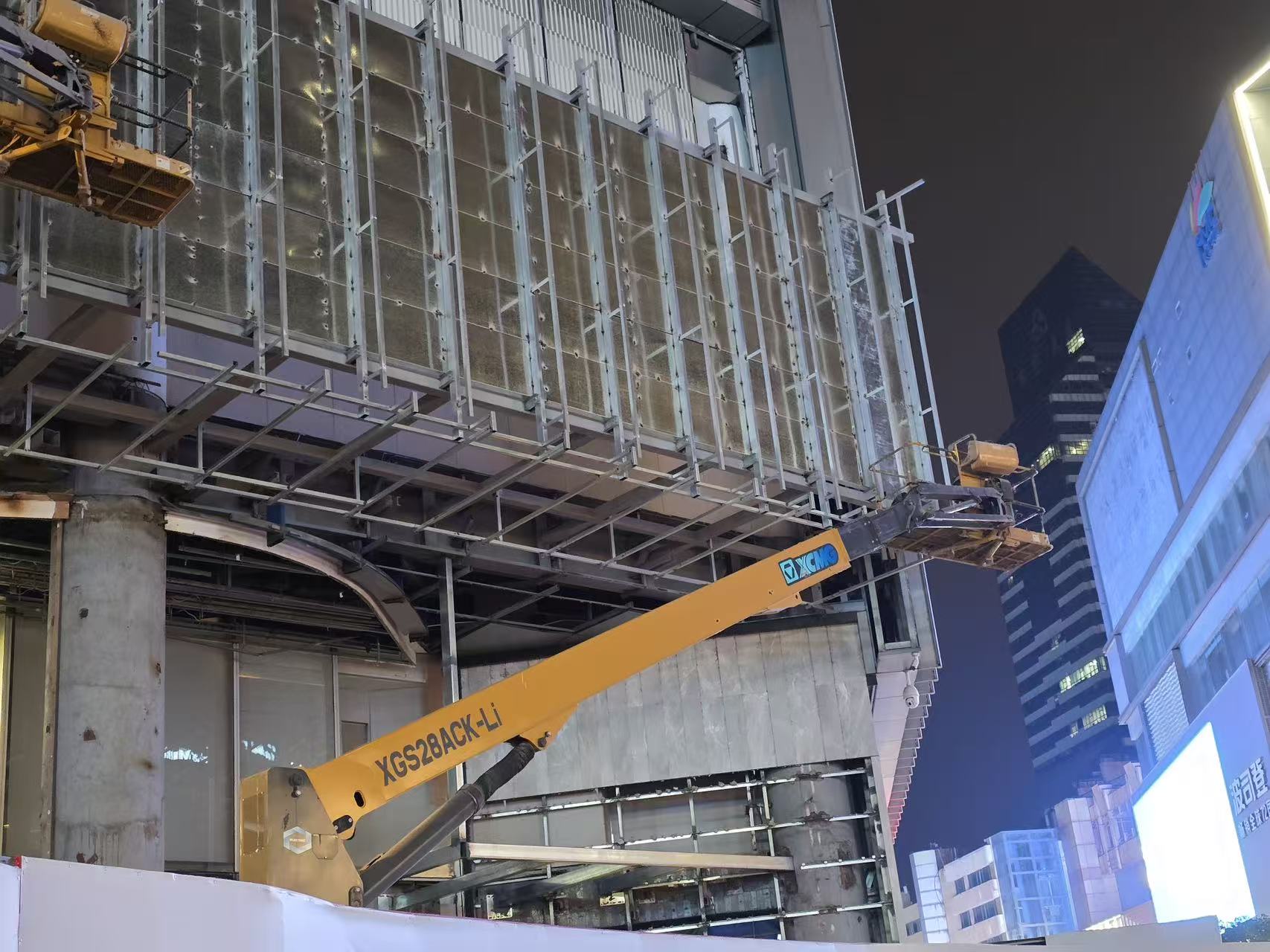 XGS28ACK-Li擁有28.8m最大作業(yè)高度,輕松覆蓋新百廣場高層外立面的幕墻安裝、鋼結(jié)構(gòu)拼接作業(yè)面;460kg的大承載量支持雙人協(xié)同施工,搭配靈活的臂架操作,大幅提升外立面改造的施工效率。更關(guān)鍵的是,設(shè)備采用鋰電驅(qū)動,實(shí)現(xiàn)零尾氣排放、低噪音作業(yè),即使在商圈白天運(yùn)營時段施工,也不會對周邊商業(yè)活動造成干擾,完美適配核心商圈的施工管控標(biāo)準(zhǔn)。
