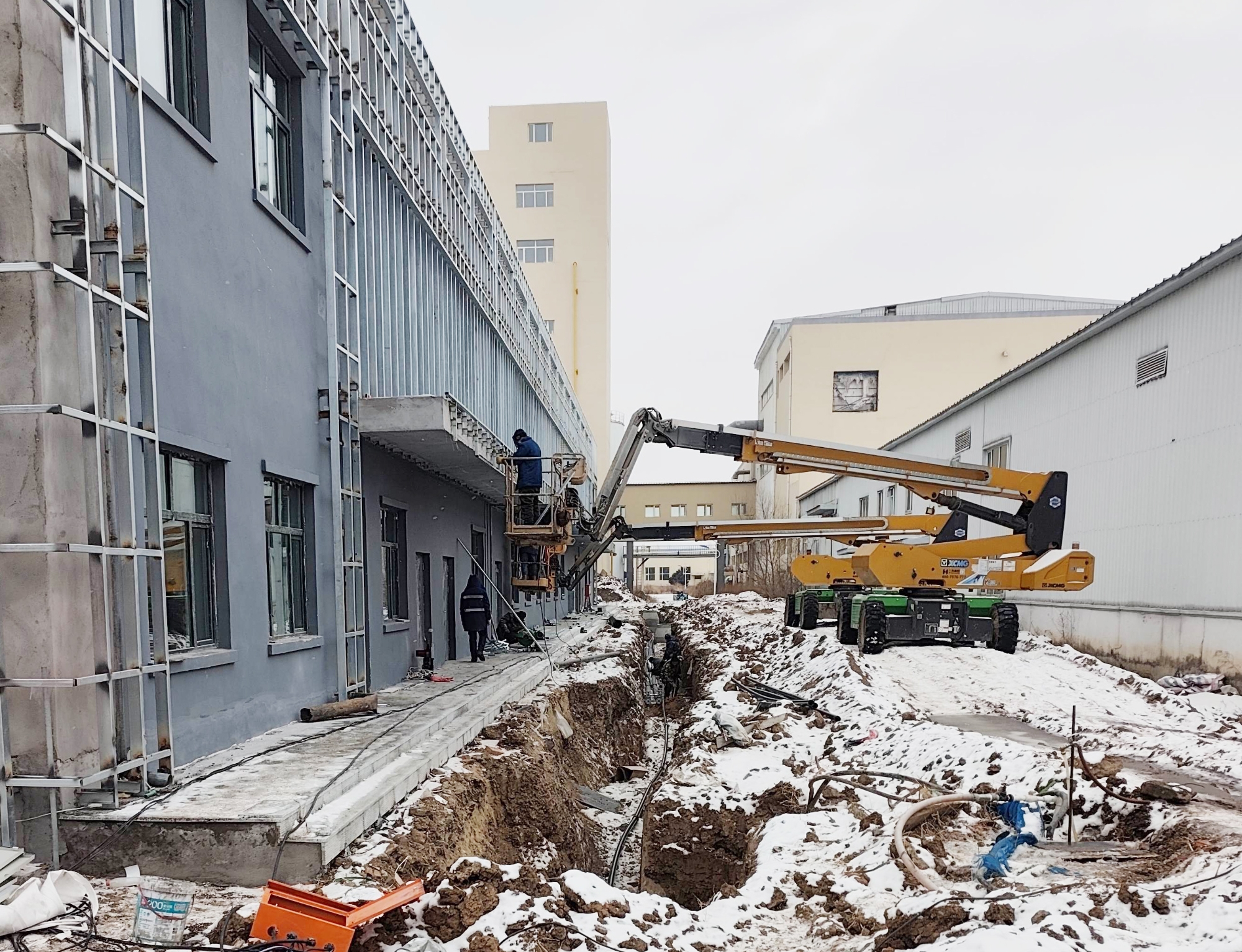 在黑龍江哈爾濱北大荒綠源冷鏈管理中心建設(shè)現(xiàn)場(chǎng),冬日的冰雪覆蓋著施工場(chǎng)地,徐工高空作業(yè)平臺(tái)卻依舊高效運(yùn)轉(zhuǎn),成為項(xiàng)目外立面施工的核心設(shè)備。