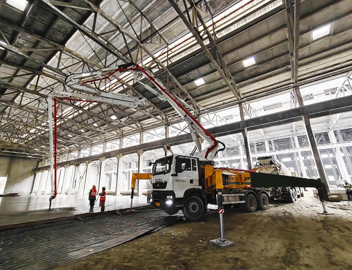 HB43V泵車搭載五節(jié)“RZ”型折疊布料桿,370°靈活旋轉無施工死角,憑借高效泵送能力適配大面積地坪連續(xù)澆筑需求,精準滿足C30混凝土強度與平整度標準。