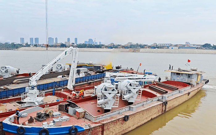 近日,專(zhuān)為水上施工定制的兩臺(tái)徐工船載式布料機(jī)與八臺(tái)船載式攪拌罐裝車(chē)順利集結(jié),正式發(fā)往越南,將投入到當(dāng)?shù)刂攸c(diǎn)跨河大橋項(xiàng)目建設(shè)中。