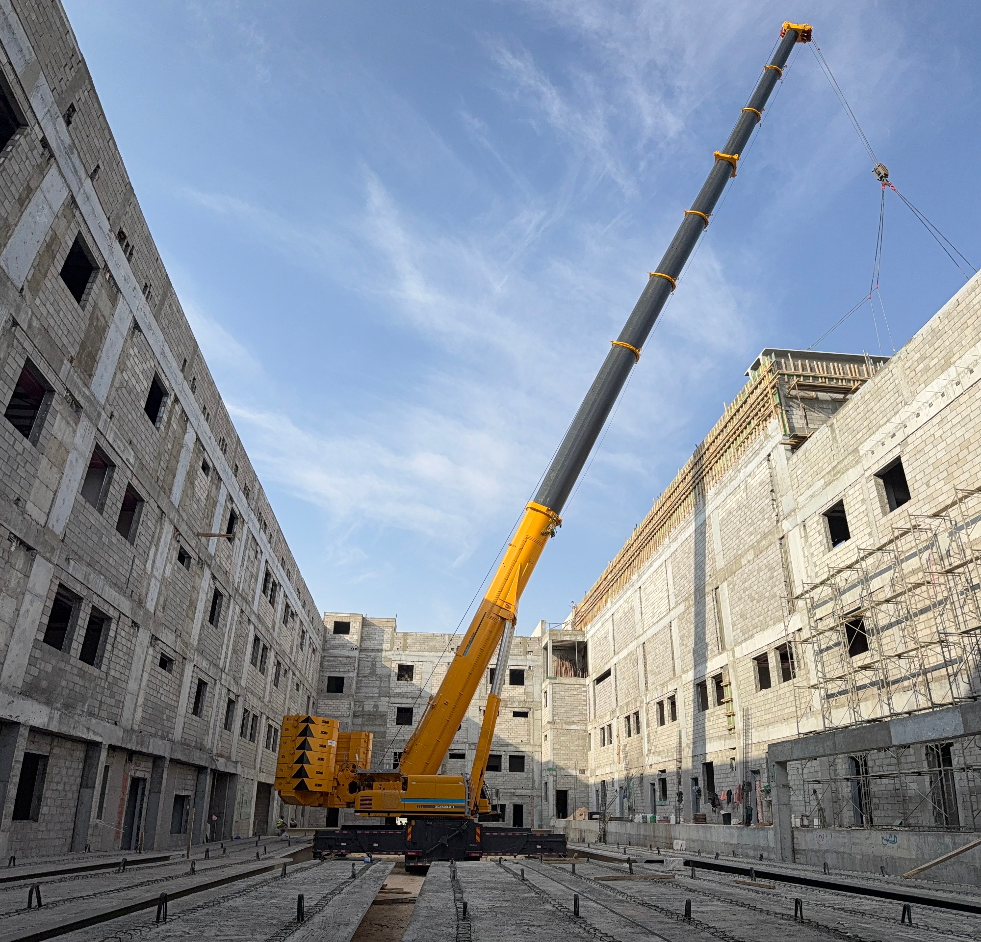 此次施工位于沙特快速發(fā)展的都市區(qū)域,項目本身對工期與精度有著嚴苛要求。高層建筑的樓板吊裝,尤其是對于重量超過十噸的大型預制構件,不僅是對起重機極限載荷能力的考驗,更涉及在復雜城市空間中的微動操作、抗風穩(wěn)定及高空精準就位等一系列高技術要求?,F場空間有限,周邊環(huán)境復雜,對設備的機動性、站位適應性以及操控的精細度提出了全方位挑戰(zhàn)。