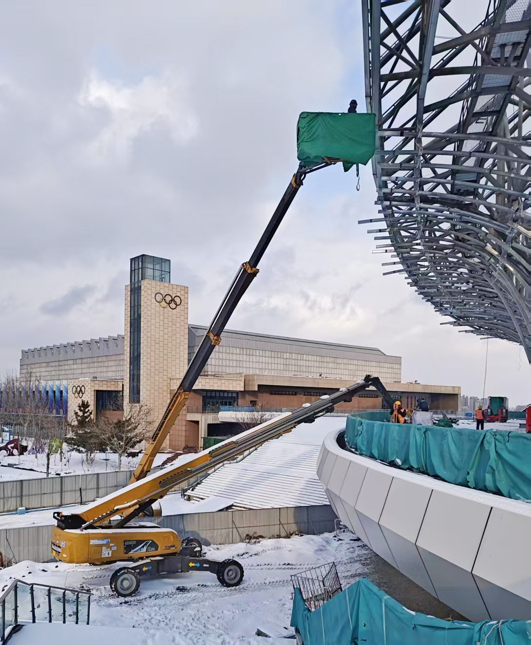 雪天不停工!16臺(tái)高米數(shù)直臂高空作業(yè)平臺(tái)硬核攻堅(jiān)蓬萊體育館項(xiàng)目