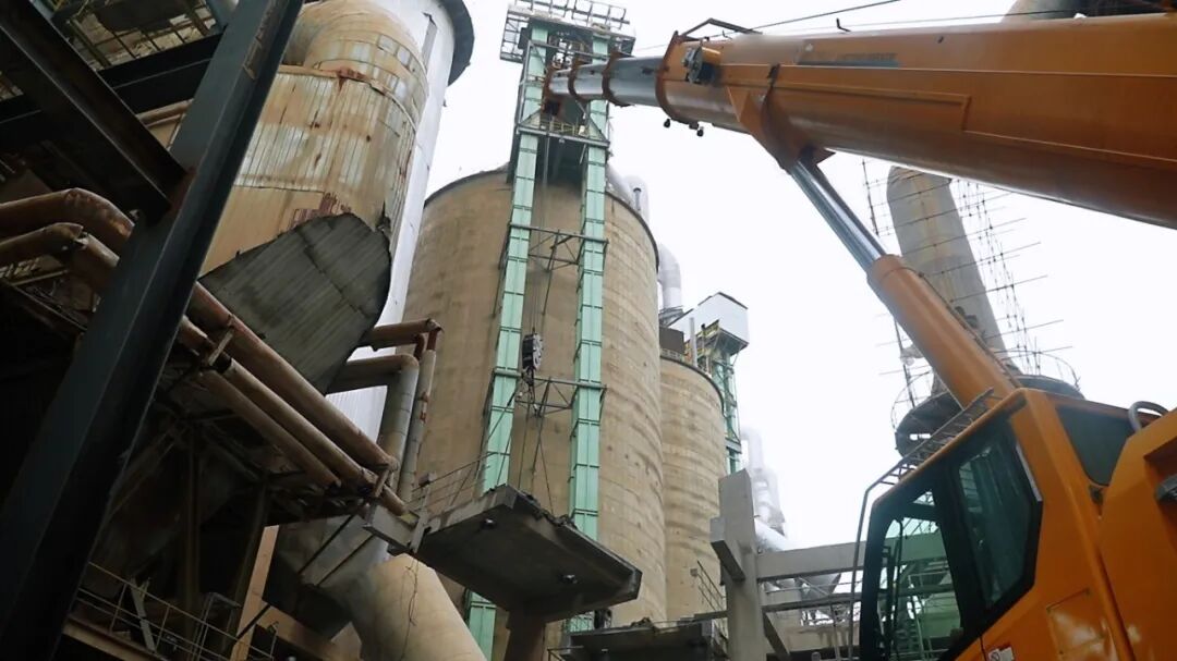 30米高、6米長(zhǎng)、5米寬,18到30噸的水泥框架,拆它本就棘手。偏偏場(chǎng)地還受限——后支腿要給旋轉(zhuǎn)配重騰地兒,前臉距離緊湊,頭頂管道壓著,大臂根本伸不開(kāi)。