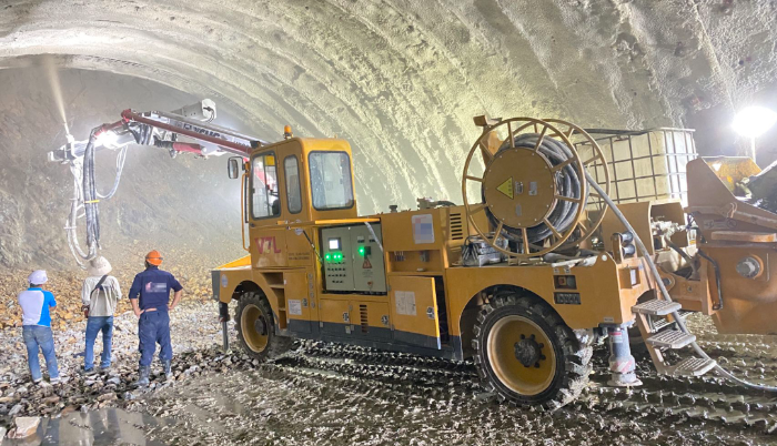 越南某隧道施工現(xiàn)場,三臺徐工混凝土噴漿車正在進(jìn)行一場“雙向奔赴”式施工。