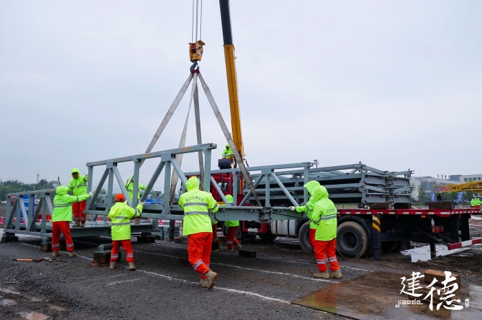 本次演練以山洪爆發(fā)、泥石流、臺風等極端氣候造成的道路內(nèi)澇深坑積水、道路大面積塌方、公路橋梁沖毀以及危化品運輸車泄漏等特殊情況為背景,模擬公路水毀阻塞交通、橋梁垮塌中斷交通,演練隊伍嚴正執(zhí)行,在規(guī)定時限內(nèi)迅速完成桁架拼裝、橋面鋪設(shè)、橋梁落座,完成公路應(yīng)急裝備漕渡任務(wù)。