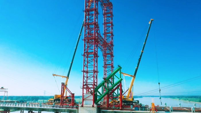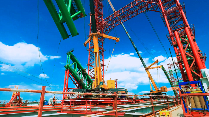 據(jù)悉,拱肋要經(jīng)過200余次吊裝拼接,才能在橋上形成一個(gè)完整的拱圈,這三臺徐工超級起重機(jī)XCA500將在項(xiàng)目駐守一年。項(xiàng)目建成后,該黃河大橋?qū)⒊蔀閲鴥?nèi)規(guī)模最大的下承式鋼管混凝土系桿拱橋,對改善區(qū)域交通條件,推動黃河流域高質(zhì)量發(fā)展具有重要意義。