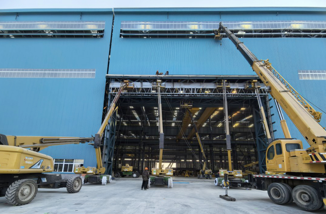 在恒力重工三期廠房建設(shè)工地,近10臺30米級徐工高空作業(yè)平臺正大顯身手,忙碌于車間內(nèi)外鋼結(jié)構(gòu)建設(shè)與墻面裝飾等精細(xì)作業(yè)。