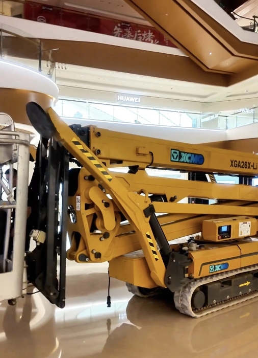 在杭州某大型商場(chǎng),徐工XGS26X-Li將四只“蜘蛛腿”穩(wěn)穩(wěn)“扎根”在商場(chǎng)中庭,正在向玻璃圍欄下方的墻壁伸展臂架。超窄車(chē)身“溜”進(jìn)商場(chǎng)、伸縮臂架“瞄”準(zhǔn)墻面,這是徐工蜘蛛車(chē)在商場(chǎng)進(jìn)行維修保養(yǎng)的日常。而看似日常的施工,需要面對(duì)三關(guān)“難題”。