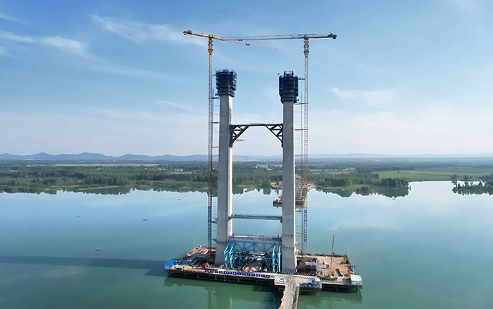 大橋主塔采用“H”型造型結(jié)構(gòu),總高度201米,XGT360-20S1、XGT7528A-18S1屹立在大橋兩側(cè)肩負(fù)主要吊裝工作,滿勤作業(yè)、高效運(yùn)轉(zhuǎn),保障高空對(duì)接安全,雙塔協(xié)力頻頻突破重要建設(shè)節(jié)點(diǎn)。
