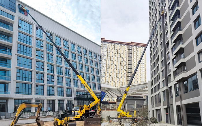 高層樓宇外側(cè)飄窗突出結(jié)構(gòu)密集分布,對高空作業(yè)的精準(zhǔn)度和靈活性要求極高。傳統(tǒng)設(shè)備因臂架笨重、跨障能力弱,難以精準(zhǔn)抵達作業(yè)點位,施工進度頻頻受阻。而徐工 GKS45A 搭載“基本臂 + 六節(jié)伸縮臂 + 獨立飛臂” 創(chuàng)新結(jié)構(gòu),緊湊靈動的小飛臂如同精準(zhǔn)的 “高空畫筆”,輕松繞開各類障礙物,穩(wěn)穩(wěn)定格每一個作業(yè)位置,完美匹配新樓施工的嚴(yán)苛需求。