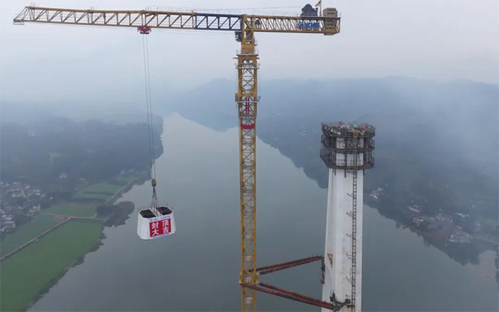 湖岷江特大橋主塔采用六邊形箱型截面,結(jié)構(gòu)復(fù)雜,高空作業(yè)安全風(fēng)險(xiǎn)大,XGT2850-120S為大橋模塊化拼裝提供了關(guān)鍵支撐。