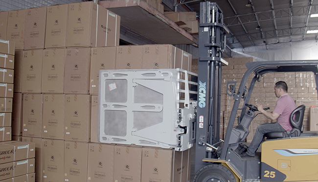 空調(diào)等家電單品價(jià)值高,鯤鵬電動叉車配備OPS安全防護(hù)系統(tǒng)、轉(zhuǎn)彎降速等功能,屬具方面專門為客戶定制了紙箱夾,高支點(diǎn)轉(zhuǎn)向橋,減小轉(zhuǎn)彎時(shí)車身擺動幅度,進(jìn)一步確保貨物和人員安全。