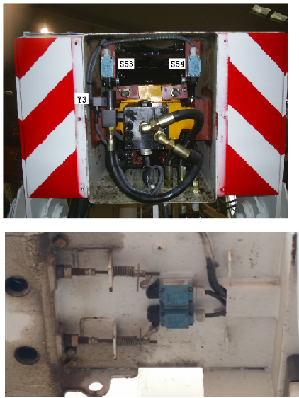 (1)檢測形式:采用行程開關(guān)檢測裝在伸縮鏈拉桿上的檢測板,一旦伸縮鏈松斷,會釋放開關(guān)搖桿,然后報警并限制臂架伸縮動作。