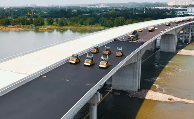 此次施工路段是典型的“橋梁密集型”路段,橋梁工程占比高達(dá)95.5%,且橋面鋪裝寬度頻繁切換,從24.5米寬幅主線到19.4米窄幅匝道,過渡段線形銜接與高程控制需達(dá)到毫米級(jí)精度。針對(duì)窄幅匝道空間受限、橫坡多變的特點(diǎn),采用伸縮攤鋪機(jī)與“分段精準(zhǔn)壓實(shí)”傳統(tǒng)工藝組合模式,克服空間作業(yè)限制;針對(duì)寬幅與窄幅過渡段,優(yōu)化攤鋪搭接工藝設(shè)置漸變過渡帶,精準(zhǔn)控制銜接處高程與平整度偏差,確保壓實(shí)質(zhì)量達(dá)標(biāo)。最終實(shí)現(xiàn)平整度<0.5、壓實(shí)度≥99.8%,全面高質(zhì)達(dá)標(biāo)。
