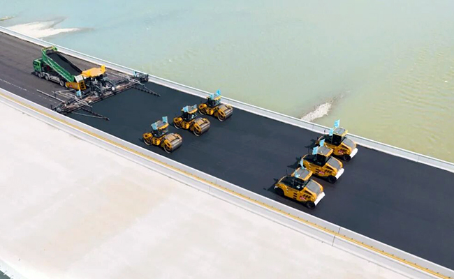 項(xiàng)目協(xié)調(diào)難度大,且易延誤工期,徐工針對(duì)性部署智慧施工集群,采用“大寬度攤鋪+北斗無人碾壓”方式,超寬幅攤鋪機(jī)一次攤鋪成型,數(shù)字化智能施工系統(tǒng)通過預(yù)設(shè)參數(shù),實(shí)現(xiàn)碾壓軌跡、遍數(shù)與溫度的精準(zhǔn)控制,從而顯著提升施工效率,快速推進(jìn)寬幅段落施工。