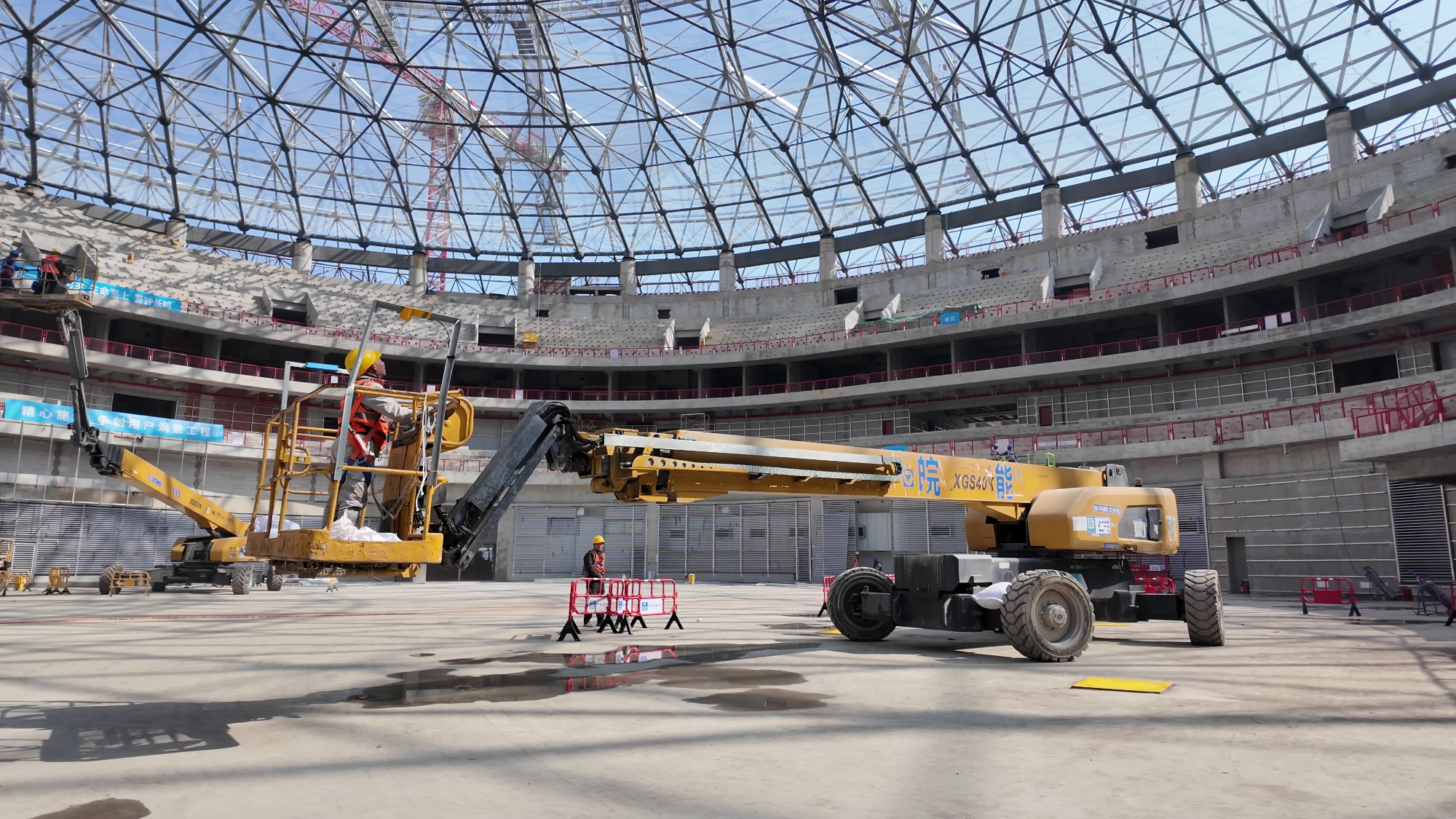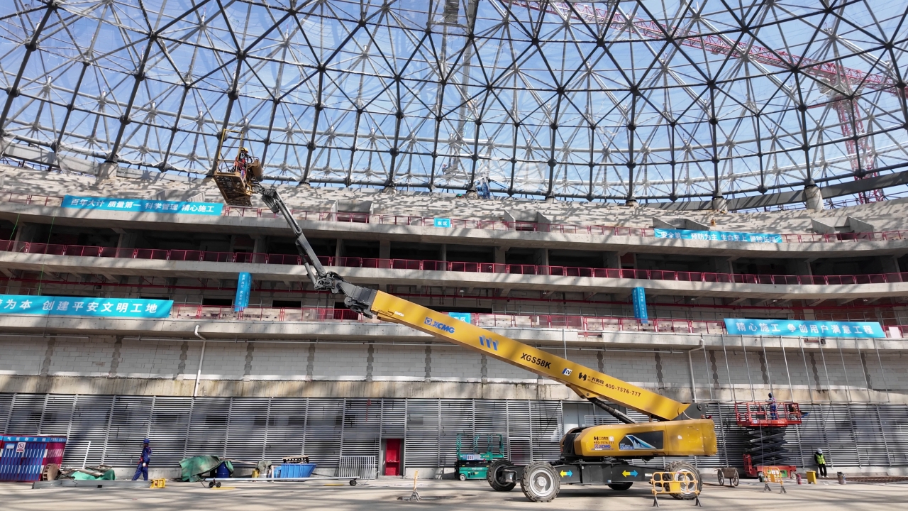 作為杭州余杭重磅文體地標(biāo),余杭國(guó)際體育中心體育館的高空施工正全力沖刺,穹頂鋼結(jié)構(gòu)焊接、全域高空油漆施工同步推進(jìn),面對(duì)場(chǎng)館作業(yè)高度跨度大、鋼結(jié)構(gòu)布局密集、施工精度與環(huán)保要求雙高的復(fù)雜工況,徐工XGS50K、XGS45ACK-Li、XGS58K多臺(tái)高空作業(yè)平臺(tái)協(xié)同發(fā)力,以全能表現(xiàn)攻克施工難題,成為場(chǎng)館建設(shè)的高空主力軍。