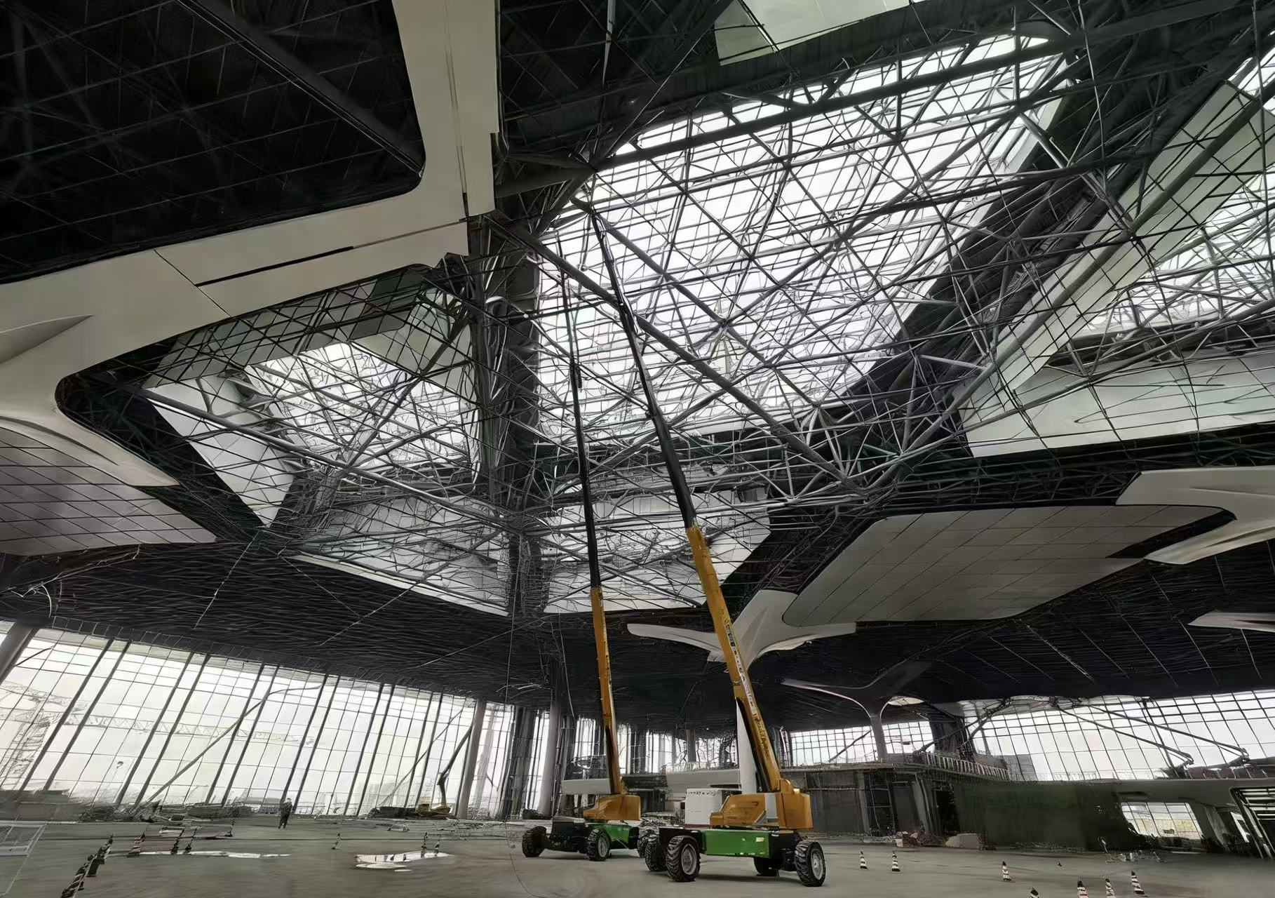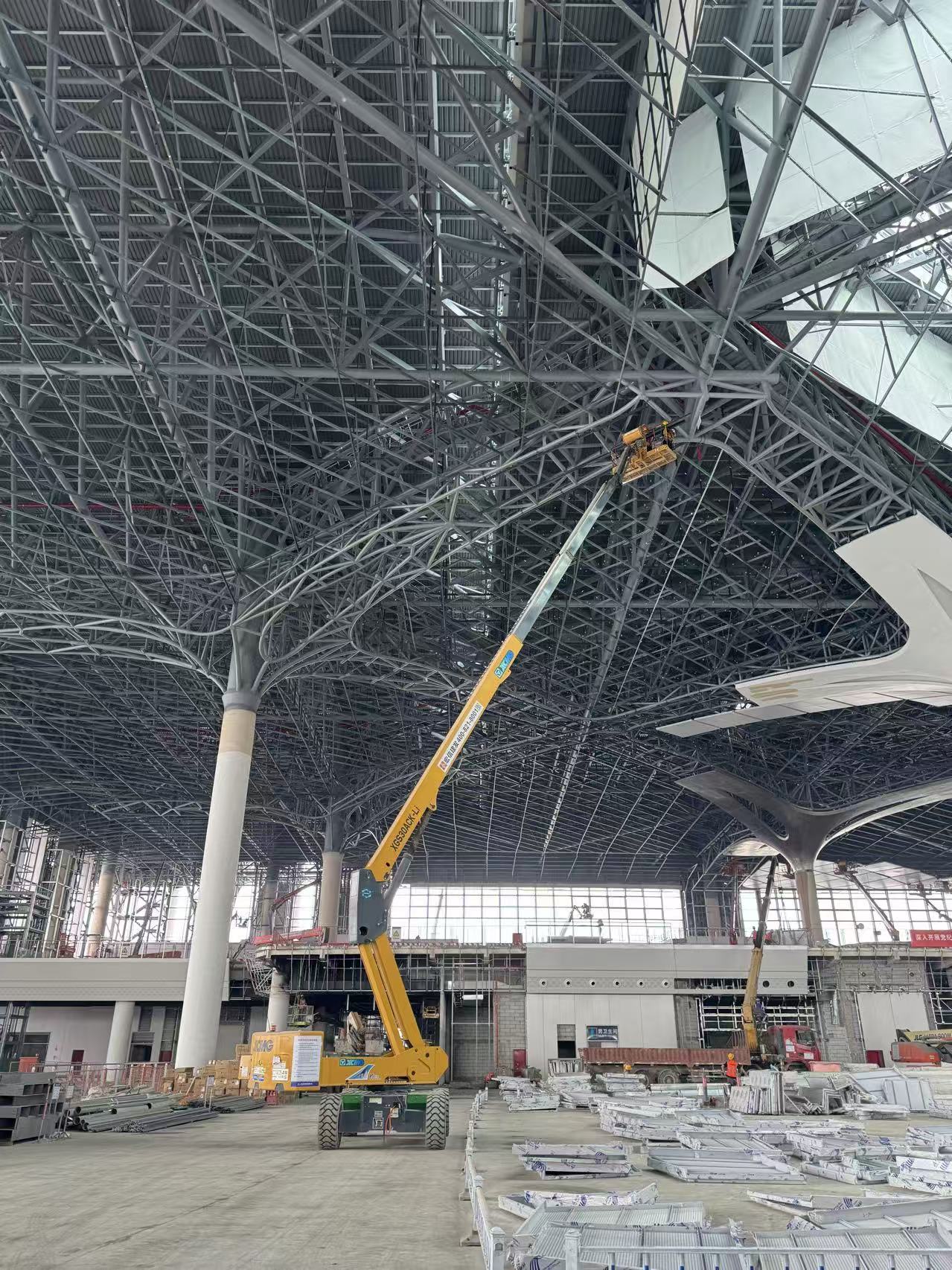 步入站房內(nèi)部,抬頭仰望,巨大的穹頂鋼結(jié)構(gòu)如編織的“榕樹”根系交錯延伸,施工難度極高。面對最高處近30米的作業(yè)高度,徐工30米級電動直臂車展現(xiàn)了其“進(jìn)得去、站得穩(wěn)、伸得準(zhǔn)”的硬核實力。設(shè)備采用緊湊設(shè)計與精準(zhǔn)操控系統(tǒng),在站內(nèi)狹長的通道和密集的臨時支撐架間靈活穿行,憑借平穩(wěn)的臂架伸縮與微動性能,施工人員得以在籃筐內(nèi)如履平地,精準(zhǔn)完成高空焊接、螺栓緊固及防火涂料噴涂。