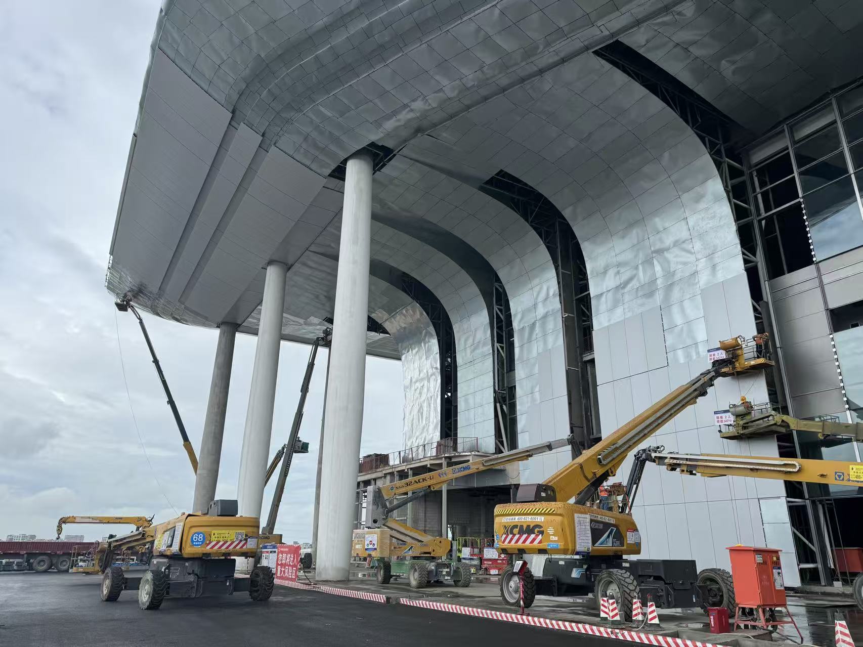 而在站房外圍,立面幕墻施工正面臨另一重考驗。異形鋁板的高精度安裝,要求設(shè)備必須具備大范圍覆蓋與穩(wěn)定的高空輸送能力。徐工大米級直臂車以超強的舉升能力和長臂架延展性,成為幕墻安裝的“主力軍”。即使在高空強風(fēng)環(huán)境下,智能臂架控制系統(tǒng)依然能保證作業(yè)平臺穩(wěn)固,讓工人能從容完成定位、校準(zhǔn)與固定。其高效的轉(zhuǎn)場能力,更使得設(shè)備在長達(dá)數(shù)百米的作業(yè)面上快速調(diào)配,大幅縮短了工期。